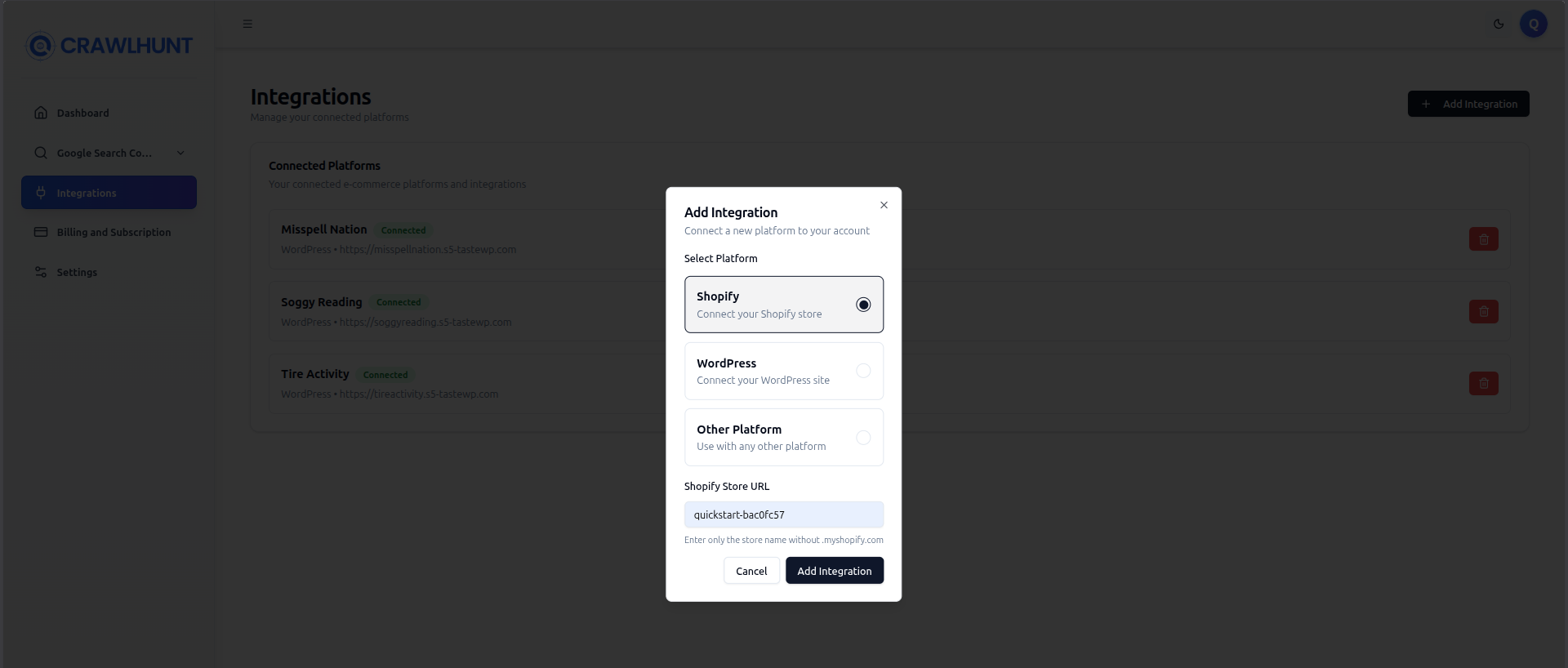Go to the Integrations page in your CrawlHunt dashboard and click Add Integration. Select Shopify as the platform, enter your Shopify store name (without .myshopify.com), and click Add Integration to proceed.